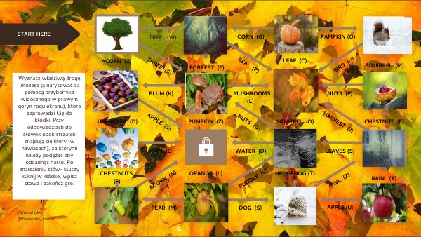 Wyznacz właściwą drogę (możesz ją narysować za pomocą przybornika widocznego w prawym góryn rogu ekranu), która zaprowadzi Cię do kłódki. Przy odpowiedziach do słówek obok strzałek znajdują się litery (w nawiasach), za którymi należy podążać aby odgadnąć hasło. Po znalezieniu słów- kluczy kliknij w kłódke, wpisz słowa i zakończ gre.
