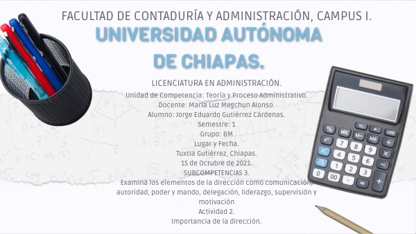 Unidad de Competencia: Teoría y Proceso Administrativo. Docente: María Luz Megchun Alonso. Alumno: Jorge Eduardo Gutiérrez Cárdenas. Semestre: 1 Grupo: BM Lugar y Fecha. Tuxtla Gutiérrez, Chiapas. 15 de Octubre de 2021. SUBCOMPETENCIAS 3. Examina los elementos de la dirección como comunicación, autoridad, poder y mando, delegación, liderazgo, supervisión y motivación Actividad 2. Importancia de la dirección.