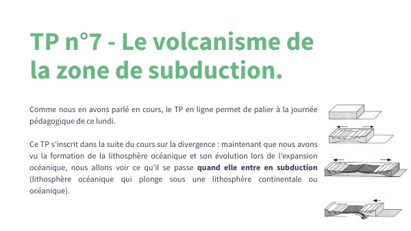 Comme nous en avons parlé en cours, le TP en ligne permet de palier à la journée pédagogique de ce lundi. Ce TP s'inscrit dans la suite du cours sur la divergence : maintenant que nous avons vu la formation de la lithosphère océanique et son évolution lors de l'expansion océanique, nous allons voir ce qu'il se passe quand elle entre en subduction (lithosphère océanique qui plonge sous une lithosphère continentale ou océanique).