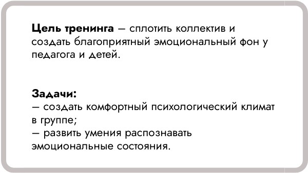 Цель тренинга – сплотить коллектив и создать благоприятный эмоциональный фон у педагога и детей. Задачи: – создать комфортный психологический климат в группе; – развить умения распознавать эмоциональные состояния.