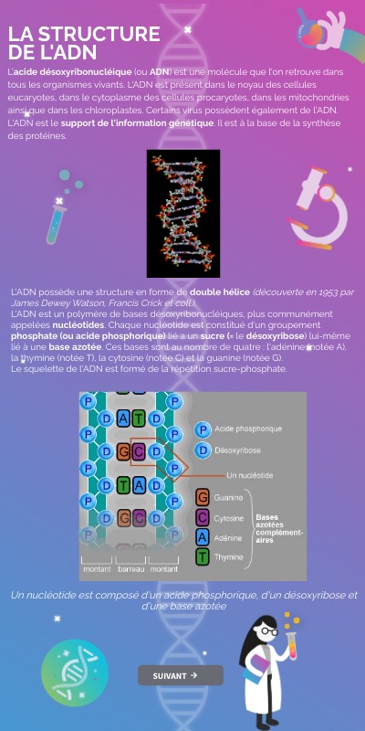 L'ADN possède une structure en forme de double hélice (découverte en 1953 par James Dewey Watson, Francis Crick et coll.). L'ADN est un polymère de bases désoxyribonucléiques, plus communément appelées nucléotides. Chaque nucléotide est constitué d'un groupement phosphate (ou acide phosphorique) lié a un sucre (= le désoxyribose) lui-même lié à une base azotée. Ces bases sont au nombre de quatre : l'adénine (notée A), la thymine (notée T), la cytosine (notée C) et la guanine (notée G). Le squelette de l'ADN est formé de la répétition sucre-phosphate.
