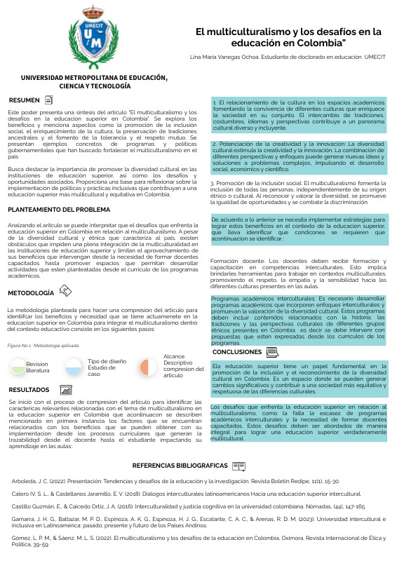 Este poster presenta una síntesis del artículo "El multiculturalismo y los desafíos en la educacion superior en Colombia". Se explora los beneficios y menciona aspectos como la promoción de la inclusión social, el enriquecimiento de la cultura, la preservación de tradiciones ancestrales y el fomento de la tolerancia y el respeto mutuo. Se presentan ejemplos concretos de programas y políticas gubernamentales que han buscado fortalecer el multiculturalismo en el país Busca destacar la importancia de promover la diversidad cultural en las instituciones de educación superior, así como los desafíos y oportunidades asociados. Proporciona una base para reflexionar sobre la implementación de políticas y prácticas inclusivas que contribuyan a una educación superior más multicultural y equitativa en Colombia.