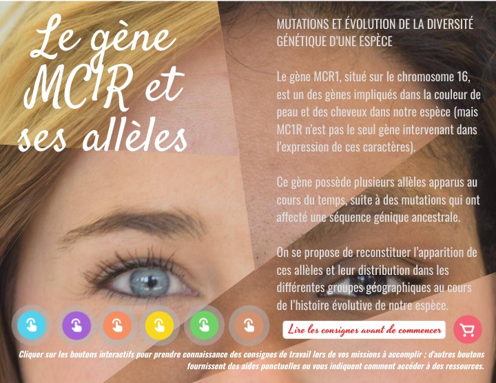 MUTATIONS ET ÉVOLUTION DE LA DIVERSITÉ GÉNÉTIQUE D’UNE ESPÈCE Le gène MCR1, situé sur le chromosome 16, est un des gènes impliqués dans la couleur de peau et des cheveux dans notre espèce (mais MC1R n’est pas le seul gène intervenant dans l’expression de ces caractères). Ce gène possède plusieurs allèles apparus au cours du temps, suite à des mutations qui ont affecté une séquence génique ancestrale. On se propose de reconstituer l’apparition de ces allèles et leur distribution dans les différentes groupes géographiques au cours de l’histoire évolutive de notre espèce.