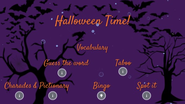 1- Take a bingo card.2- Write some words from the Halloween vocabulary. You can remember the vocabulary and costumes in this icon! 3- Ready to play Bingo? Tap on the Play icon to start the game!