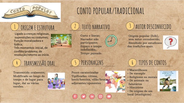 Ligado a crenças religiosas, superstições ou costumes; Função moralizadora e lúdica; Três momentos: inicial, de conflito/problema, de resolução/retorno ao início.