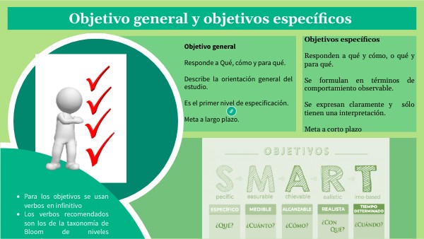 Objetivo general Responde a Qué, cómo y para qué. Describe la orientación general del estudio. Es el primer nivel de especificación. Meta a largo plazo.