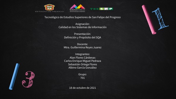Tecnológico de Estudios Superiores de San Felipe del ProgresoAsignación:Calidad en los Sistemas de InformaciónPresentación:Definición y Propósito del SQADocente:Mtra. Guillermina Reyes JuarezIntegrantes:Alan Flores Cárdenas Carlos Enrique Miguel Pedraza Sebastián Ortega FloresAlbino García GonzálezGrupo:70118 de octubre de 2021