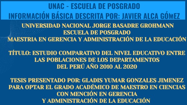 UNIVERSIDAD NACIONAL JORGE BASADRE GROHMANNESCUELA DE POSGRADO MAESTRIA EN GERENCIA Y ADMINISTRACIÓN DE LA EDUCACIÓN TÍTULO: ESTUDIO COMPARATIVO DEL NIVEL EDUCATIVO ENTRE LAS POBLACIONES DE LOS DEPARTAMENTOS DEL PERÚ AÑO 2010 AL 2020 TESIS PRESENTADO POR: GLADIS YUMAR GONZALES JIMENEZ PARA OPTAR EL GRADO ACADÉMICO DE MAESTRO EN CIENCIAS CON MENCIÓN EN GERENCIA Y ADMINISTRACIÓN DE LA EDUCACIÓN