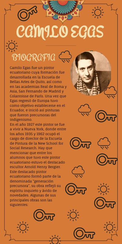 Camilo Egas fue un pintor ecuatoriano cuya formación fue desarrollada en la Escuela de Bellas Artes de Quito, así como en las academias Real de Roma y Asia, San Fernando de Madrid y Colarroisse de París. Una vez que Egas regresó de Europa tuvo como objetivo establecerse en el Ecuador, e inició así pinturas que fueron precursoras del indigenismo. En el año 1927 este pintor se fue a vivir a Nueva York, donde entre los años 1935 y 1962 ocupó el cargo de director de la Escuela de Pintura de la New School for Social Research. Hay que mencionar que entre los alumnos que tuvo este pintor ecuatoriano estuvo el destacado escultor Arnold Henry Bergier. Este destacado pintor ecuatoriano formó parte de la denominada “generación precursora”, su obra reflejó su espíritu inquieto y ávido de novedades. Algunas de sus principales obras son las siguientes: