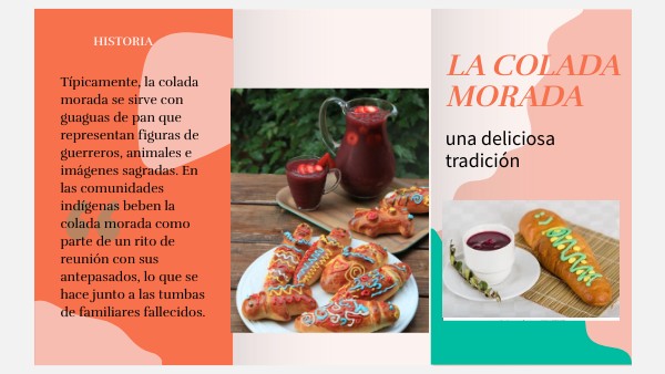 Típicamente, la colada morada se sirve con guaguas de pan que representan figuras de guerreros, animales e imágenes sagradas. En las comunidades indígenas beben la colada morada como parte de un rito de reunión con sus antepasados, lo que se hace junto a las tumbas de familiares fallecidos.