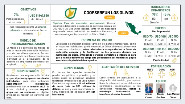 Objetivo Plan de mercadeo internacional: Generar expansión del modelo de negocio de previsión exequial de COOPSERFUN Los Olivos Bogotá, tanto en su modalidad empresarial como individual, en territorio Mexicano, a través de una agencia comercial Los Olivos México.