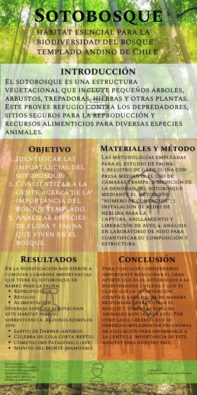 Para concluir consideramos importante mencionar el gran aporte que es el sotobosque a la biodiversidad chilena y que es clave que la intervención científica sea hecha de manera responsable para cuidar el bosque y todas las especies animales asociadas a este. Por otro lado, creemos que se deberían implementar programas de educación para informarle a la gente la importancia de este hábitat para nuestro país.