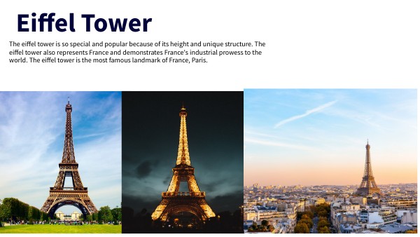 The eiffel tower is so special and popular because of its height and unique structure. The eiffel tower also represents France and demonstrates France's industrial prowess to the world. The eiffel tower is the most famous landmark of France, Paris.