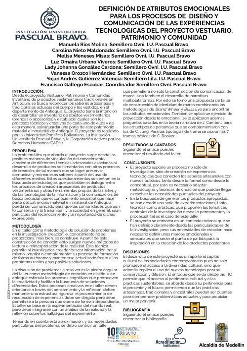 Manuela Rios Molina: Semillero Ovni. I.U. Pascual Bravo Carolina Nieto Maldonado: Semillero Ovni. I.U. Pascual Bravo Melisa Meneses Misas: Semillero Ovni. I.U. Pascual Bravo Luz Omaira Urbano Viveros: Semillero Ovni. I.U. Pascual Bravo Lady Johanna González Cardona: Semillero Ovni. I.U. Pascual Bravo Vanessa Orozco Hernández: Semillero Ovni. I.U. Pascual Bravo Yojan Andrés Gutiérrez Valencia: Semillero Lila. I.U. Pascual Bravo Francisco Gallego Escobar: Coordinador Semillero Ovni. Pascual Bravo