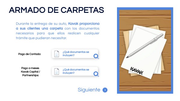 Durante la entrega de su auto, Kavak proporciona a sus clientes una carpeta con los documentos necesarios para que ellos realicen cualquier trámite que pudieran necesitar.