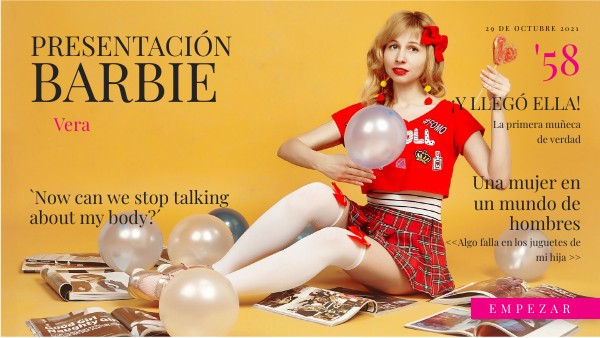 En el lanzamiento de 2016 de la nueva Barbie, la revista americana Time, sacó esta portada, en la que vemos a Barbie exclamando: <<¿ Podemos dejar de hablar de mi cuerpo?>> CONCLUSIÓN La Barbie, no fué creada para dar la imagen que tenemos hoy de ella. Fue creada como ejemplo de mujer independiente para las niñas de la época, para crear ese cambio en las niñas, y de algún modo, cambiar el mundo. Lo que ha ocurrido es que con el paso de los años, la Barbie ha cambiado a peor y se ha convertido en un mal ejemplo para los pequeños, por sus necesidad de compra y por su ideal de belleza. La empresa de Barbie, Mattel, se ha dado cuenta y ha intentado volver a sus comienzos lanzando estas nuevas muñecas (2016 ) .