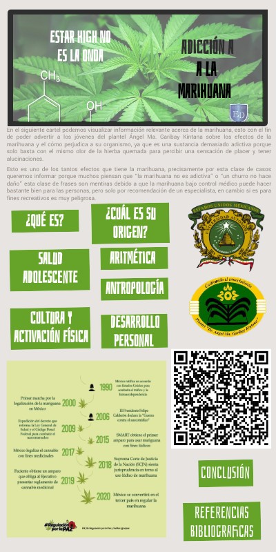 En el siguiente cartel podemos visualizar información relevante acerca de la marihuana, esto con el fin de poder advertir a los jóvenes del plantel Ángel Ma. Garibay Kintana sobre los efectos de la marihuana y el cómo perjudica a su organismo, ya que es una sustancia demasiado adictiva porque solo basta con el mismo olor de la hierba quemada para percibir una sensación de placer y tener alucinaciones. Esto es uno de los tantos efectos que tiene la marihuana, precisamente por esta clase de casos queremos informar porque muchos piensan que “la marihuana no es adictiva” o “un churro no hace daño” esta clase de frases son mentiras debido a que la marihuana bajo control médico puede hacer bastante bien para las personas, pero solo por recomendación de un especialista, en cambio si es para fines recreativos es muy peligrosa.
