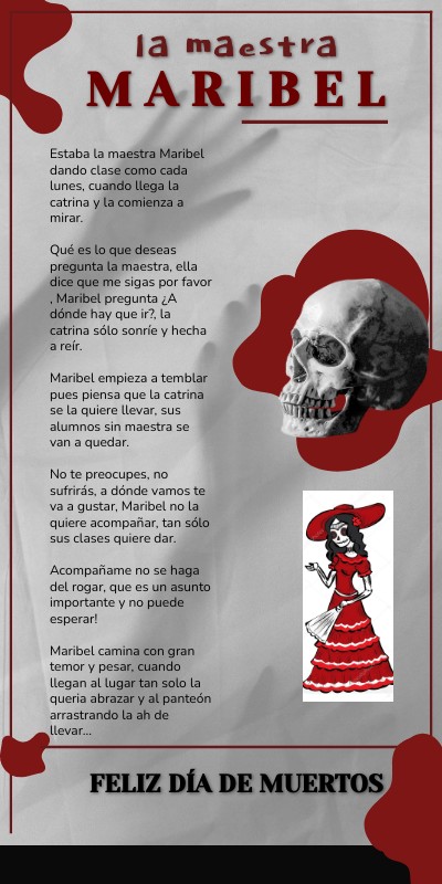Estaba la maestra Maribel dando clase como cada lunes, cuando llega la catrina y la comienza a mirar. Qué es lo que deseas pregunta la maestra, ella dice que me sigas por favor , Maribel pregunta ¿A dónde hay que ir?, la catrina sólo sonríe y hecha a reír. Maribel empieza a temblar pues piensa que la catrina se la quiere llevar, sus alumnos sin maestra se van a quedar. No te preocupes, no sufrirás, a dónde vamos te va a gustar, Maribel no la quiere acompañar, tan sólo sus clases quiere dar. Acompañame no se haga del rogar, que es un asunto importante y no puede esperar! Maribel camina con gran temor y pesar, cuando llegan al lugar tan solo la queria abrazar y al panteón arrastrando la ah de llevar...
