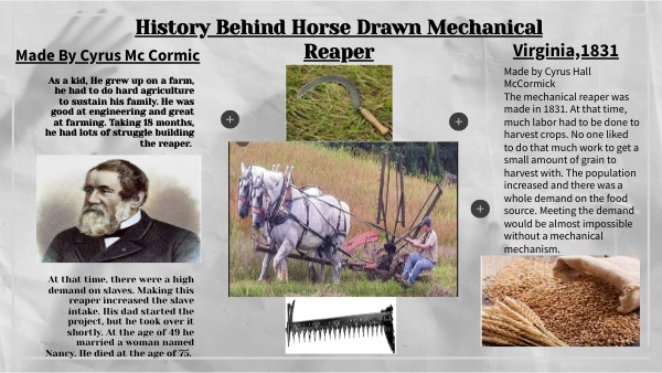 “McCormick-Deering No. 9 Horse-Drawn Mower Serviceman's Guide.” Small Farmer's Journal, 5 Dec. 2019, https://smallfarmersjournal.com/mccormick-deering-no-9-horse-drawn-mower-servicemans-guide/. “Take Online Courses. Earn College Credit. Research Schools, Degrees & Careers.” Study.com | Take Online Courses. Earn College Credit. Research Schools, Degrees & Careers, https://study.com/academy/lesson/mechanical-reaper-invention-impact-facts.html. McNamara, Robert. “A Mechanical Harvesting Machine Revolutionized Life on the Farm.” ThoughtCo, ThoughtCo, 21 June 2019, https://www.thoughtco.com/mccormick-reaper-1773393. https://lemelson.mit.edu/resources/cyrus-mccormick