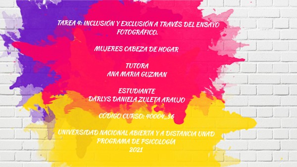 Tarea 4: Inclusión y exclusión a través del ensayo fotográfico. Mujeres cabeza de Hogar TUTORA ANA MARIA GUZMAN ESTUDIANTE DARLYS DANIELA ZULETA ARAUJO CÓDIGO CURSO: 40004_56 UNIVERSIDAD NACIONAL ABIERTA Y A DISTANCIA UNAD PROGRAMA DE PSICOLOGÍA 2021