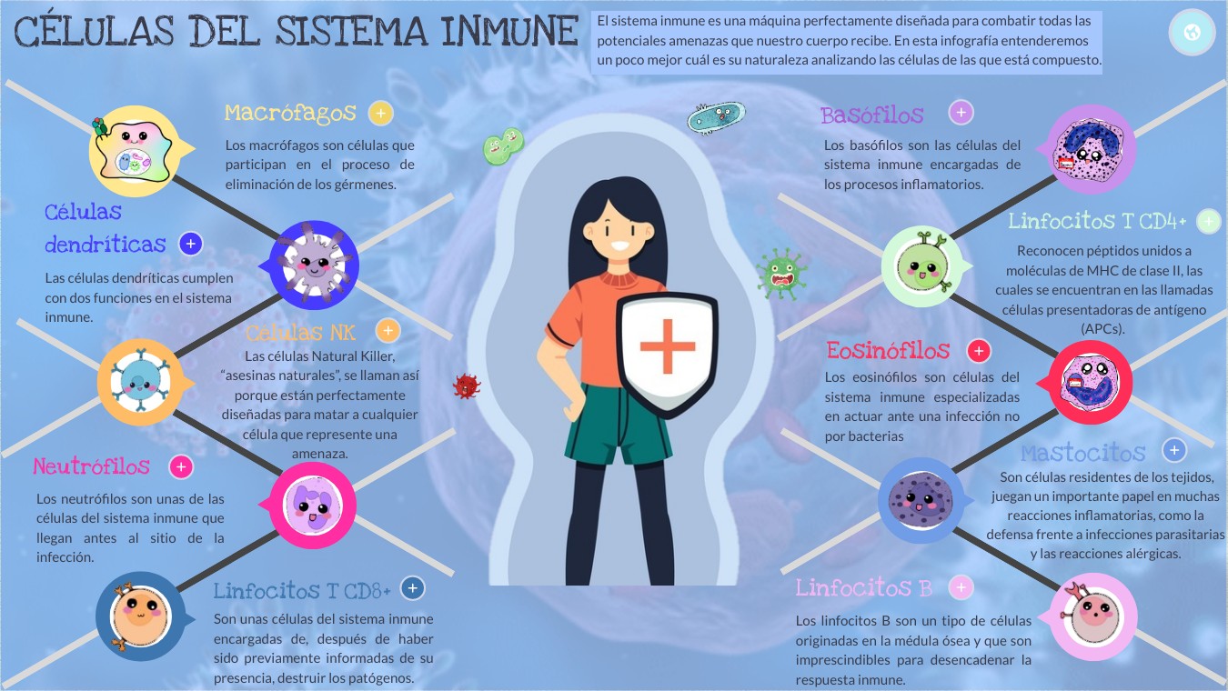El sistema inmune es una máquina perfectamente diseñada para combatir todas las potenciales amenazas que nuestro cuerpo recibe. En esta infografía entenderemos un poco mejor cuál es su naturaleza analizando las células de las que está compuesto.