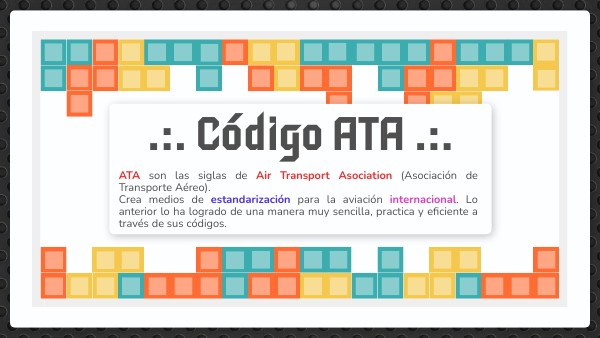 ATA son las siglas de Air Transport Asociation (Asociación de Transporte Aéreo). Crea medios de estandarización para la aviación internacional. Lo anterior lo ha logrado de una manera muy sencilla, practica y eficiente a través de sus códigos.