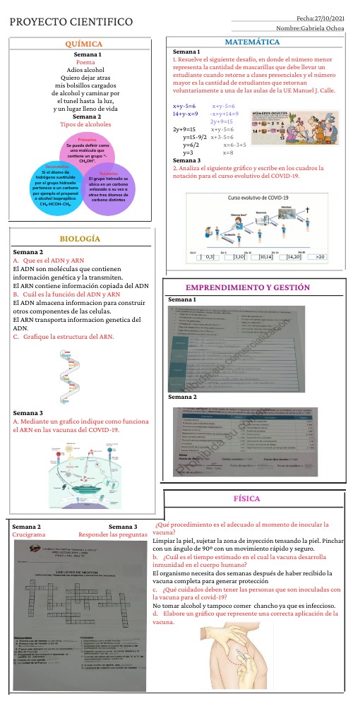 Semana 1 1. Resuelve el siguiente desafío, en donde el número menor representa la cantidad de mascarillas que debe llevar un estudiante cuando retorne a clases presenciales y el número mayor es la cantidad de estudiantes que retornan voluntariamente a una de las aulas de la UE Manuel J. Calle. x+y-5=6 x+y-5=6 14+y-x=9 -x+y+14=9 2y+9=15 2y+9=15 x+y-5=6 y=15-9/2 x+3-5=6 y=6/2 x=6-3+5 y=3 x=8 Semana 3 2. Analiza el siguiente gráfico y escribe en los cuadros la notación para el curso evolutivo del COVID-19.
