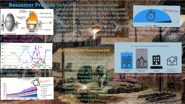 In conclusion we learned that the Bessemer Process was a steel making machine that was highly effiecent and was made in 1856 by Henry Bessemer. We also learned how it worked. It worked by taking imputrities out of the iron and made steel. The Bessemer Process greatly helped the making of many things that used steel such as skyscrapers and water wheels.