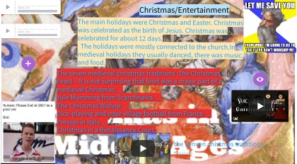 The main holidays were Christmas and Easter. Christmas was celebrated as the birth of Jesus. Christmas was celebrated for about 12 days. The holidays were mostly connected to the church.In medieval holidays they usually danced, there was music, and food.