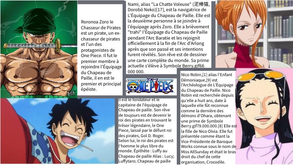 Il est le fondateur et le capitaine de l'équipage de Chapeau de paille. Son rêve de toujours est de devenir le roi des pirates en trouvant le trésor légendaire, le One Piece, laissé par le défunt roi des pirates, Gol D. Roger. Selon lui, le roi des pirates est l'homme le plus libre du monde. Épithète : Luffy au Chapeau de paille Alias : Lucy; Luffytaro; Chapeau de paille