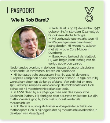 Nederlandse pioniers in de toen nieuwe duursportdiscipline bestaande uit zwemmen, fietsen en hardlopen. ▪ Hij behaalde vele successen. In 1985 was hij de eerste Europees kampioen op de olympische afstand. In 1994 werd hij wereldkampioen op de lange afstand. Van 1985 tot en met 1988 was hij Europees kampioen op de middenafstand. Ook behaalde hij meerdere Nederlandse titels. ▪ In 2000 deed hij als 42-jarige mee aan de Olympische Spelen in Sydney. Hij eindigde daar als 43ste en laatste. Na zijn triatloncarrière ging hij (ook met succes) verder als mountainbiker. ▪ Rob Barel is nu nog als trainer en begeleider actief in de triatlonsport. Ook is hij begeleider bij mountainbikevakanties in de Alpen van Vasa Sport.