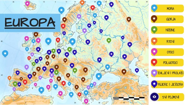 Nauči i vježbaj smještaj najvećih reljefnih cjelina Europe: mora, gorja, nizine, poluotoci, otoci, rijeke, zaljevi i rtovi.