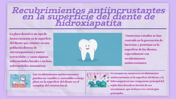 Se revisaron numerosos recubrimientos antiincrustantes en la superficie del diente y la hidroxiapatita (HA) (como componente principal del tejido duro dental) Se resumen en función de sus diferentes mecanismos, que incluyen tres estrategias principales