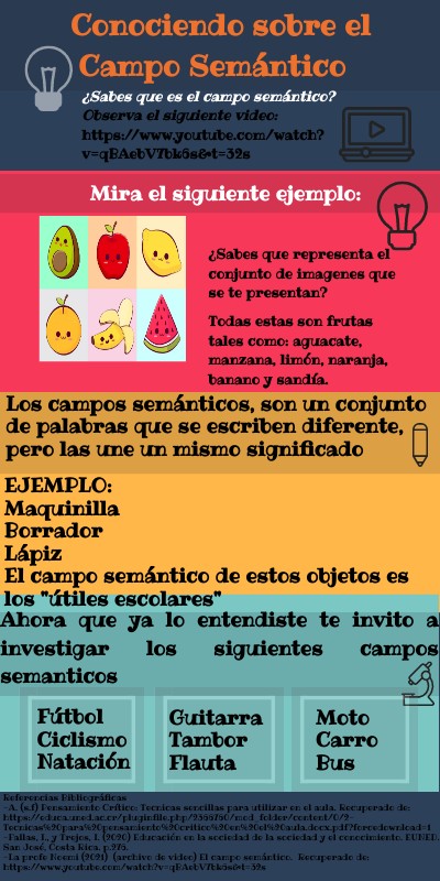 Referencias Bibliográficas -A. (s.f) Pensamiento Crítico: Tecnicas sencillas para utilizar en el aula. Recuperado de: https://educa.uned.ac.cr/pluginfile.php/2366760/mod_folder/content/0/2-Tecnicas%20para%20pensamiento%20critico%20en%20el%20aula.docx.pdf?forcedownload=1-Fallas, I., y Trejos, I. (2020) Educación en la sociedad de la sociedad y el conocimiento. EUNED. San José, Costa Rica. p.276. -La profe Noemi (2021) (archivo de video) El campo semántico. Recuperado de: https://www.youtube.com/watch?v=qBAebV7bk6s&t=32s