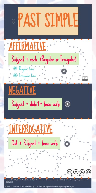 • Idioma Academy. (2018, febrero 6). Pasado Simple en INGLES # 7 (Pronunciación de las "ED" en los verbos en pasado) - PAST TENSE. [Vídeo]. Youtube. https://www.youtube.com/watch?v=khX7ZLUSR54 • McLellan, C. (2018, diciembre 21). Los verbos irregulares en inglés. British Council España. https://www.britishcouncil.es/blog/pasado-simple-verbos-irregulares