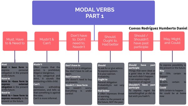 Must Must + base form to express personal obligation in the present or the future. Have to Have to +base form to express external obigation in the present or the future. Need to Need to + base form to express necessity in the present or the future.