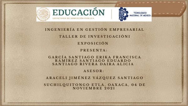 INGENIERÍA EN GESTIÓN EMPRESARIAL TALLER DE INVESTIGACIÓNI EXPOSICIÓN PRESENTA: GARCÍA SANTIAGO ERIKA FRANCISCA RAMÍREZ SANTIAGO EDUARDO SANTIAGO RIVERA DAIRA ALICIA ASESOR: ARACELI JIMÉNEZ VÁZQUEZ SANTIAGO SUCHILQUITONGO ETLA, OAXACA, 04 DE NOVIEMBRE 2021