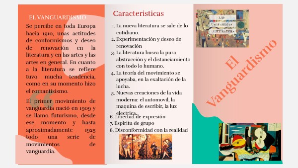 Se percibe en toda Europa hacia 1910, unas actitudes de conformismos y deseo de renovación en la literatura y en las artes y las artes en general. En cuanto a la literatura se refiere tuvo mucha tendencia, como en su momento hizo el romantisismo. El primer movimiento de vanguardia nació en 1909 y se llamo futurismo, desde ese momento y hasta aproximadamente 1925 todo una serie de movimientos de vanguardia.