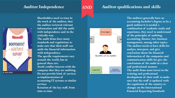 Shareholders need to trust in the work of the auditor, that the auditor reviewed relevant information and did the audit with independence and in the critically way. The audit firms have many standards and regulations to make sure that their staff can audit the financial information with independence. The specific requirements vary around the world, but in general these are: Avoid conflict interest with the company that they are auditing. Do not provide kind of services as implementation of accounting IT systems or similar services Rotation of the key staff, from time to time.