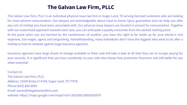 The Galvan Law Firm, PLLC is an individual physical issue law firm in Sugar Land, TX serving harmed customers who are looking for most extreme remuneration. Our lawyers are knowledgeable about close to home injury guarantees and can help you after any sort of mishap you have been associated with. Our physical issue lawyers are forceful in pursuit for remuneration. Together with our customized approach towards each case, you can anticipate a quality encounter from the earliest starting point. At the point when you are harmed by the carelessness of another, you have the right to be made up for your doctor's visit expenses, lost wages, agony and languishing. Notwithstanding, many individuals don't have the foggiest idea what to do after a mishap or how to retaliate against large insurance agencies. Insurance agencies have large chunk of change available to them and will take a stab at all that they can to escape paying for your wounds. It is significant that you have somebody on your side who knows how protection functions and will battle for you when essential. Contact Us The Galvan Law Firm, PLLC Address: 12440 Emily Ct #704, Sugar Land, TX 77478 Phone:(832) 800-8000 Email: aaron@thegalvanlawfirm.com website: https://maps.google.com/maps?cid=1302336218928162979