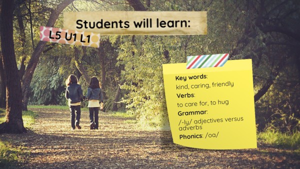 Key words: kind, caring, friendly Verbs: to care for, to hug Grammar: /-ly/ adjectives versus adverbs Phonics: /oa/