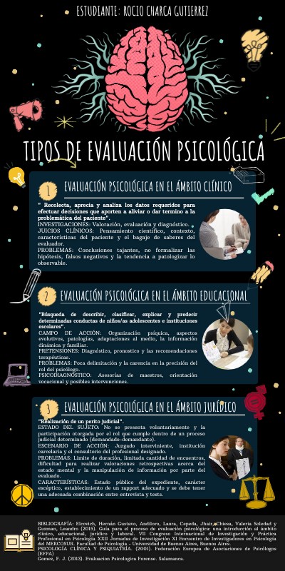 BIBLIOGRAFÍA: Elcovich, Hernán Gustavo, Andiloro, Laura, Cepeda, Jhair, Chiesa, Valeria Soledad y Guzman, Leandro (2015). Guía para el proceso de evaluación psicológica: una introducción al ámbito clínico, educacional, jurídico y laboral. VII Congreso Internacional de Investigación y Práctica Profesional en Psicología XXII Jornadas de Investigación XI Encuentro de Investigadores en Psicología del MERCOSUR. Facultad de Psicología - Universidad de Buenos Aires, Buenos Aires.PSICOLOGÍA CLÍNICA Y PSIQUIATRÍA. (2001). Federación Europea de Asociaciones de Psicólogos (EFPA) Gomez, F. J. (2013). Evaluacion Psicologica Forense. Salamanca.
