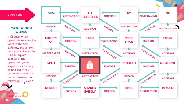 1. Choose which operation matches the word in the box. 2. Follow the arrows until you arrive at the "LOCK" square. 3. Enter in the operation symbol sequence as the key to find out if you correctly solved the maze. Use only the following: + - x or /