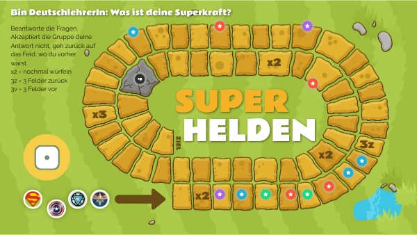 Beantworte die Fragen. Akzeptiert die Gruppe deine Antwort nicht, geh zurück auf das Feld, wo du vorher warst.x2 = nochmal würfeln 3z = 3 Felder zurück 3v = 3 Felder vor
