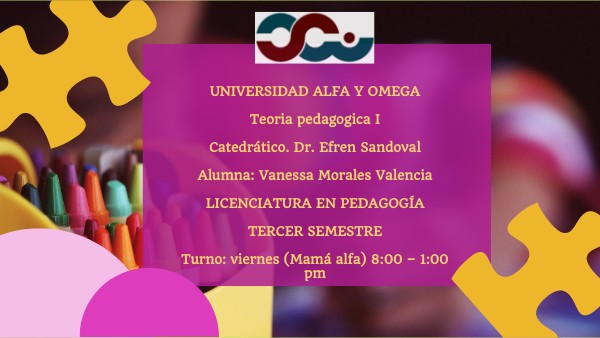 UNIVERSIDAD ALFA Y OMEGA Teoria pedagogica I Catedrático. Dr. Efren Sandoval Alumna: Vanessa Morales Valencia LICENCIATURA EN PEDAGOGÍA TERCER SEMESTRE Turno: viernes (Mamá alfa) 8:00 – 1:00 pm
