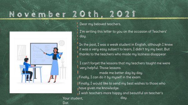 Finally, I would like to send my best wishes to those who have given me knowledge. I wish teachers more happy and beautiful on teacher's day.
