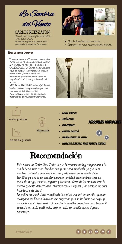 Esta novela de Carlos Ruiz Zafon, si que la recomendaría y esa persona a la que lo haría sería a un familiar mío, y esa sería mi abuela ya que tiene muchos contenidos de lo que a ella se que le gusta leer a demás de la temática ya que es de carácter amoroso, amistad pero también tiene un toque de intriga, secretos, engaños y tradición. Otros de los motivos sería lo mucho que está desarrollada sobretodo con los lugares y las personas lo cual hace todo más visual. No utiliza un vocabulario complicado lo cual es una lectura sencilla , y nada recargada eso lleva a lo mucho que engancha y es de los libros que coges y no sueltas hasta terminarlo. Sin olvidar la increíble capacidad para transmitir sensaciones hasta sentir odio, amor o hasta compasión hacia algunos personajes.