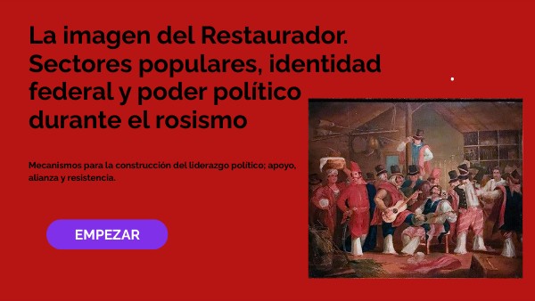 1. Hace de cuenta que estamos en el medio de una campaña electoral, Juan Manuel de Rosas es contemporáneo a nosotros, se presenta como candidato y sos vos el / la que está encargado de la prensa de su gobierno. Crea una publicidad que el gobernador publicará en su cuenta de Instagram para recaudar votos, esta deberá incluir : -una foto del gobernador - lema de campaña -2 propuestas políticas 2. Aborda, por medio de la elaboración de un meme, algunos de los siguientes temas: • la lucha política con los unitarios y el uso de la violencia • El apoyo de los sectores populares al restaurador • La relación ambigua entre el mantenimiento del orden y el apoyo en los sectores populares como principal legitimación del régimen • El vínculo entre el poder militar y el poder político • La propaganda como medio de legitimación política • La persecución a sus enemigos (unitarios y “falsos federales”)