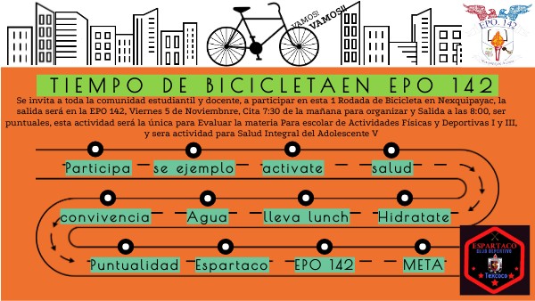 Se invita a toda la comunidad estudiantil y docente, a participar en esta 1 Rodada de Bicicleta en Nexquipayac, la salida será en la EPO 142, Viernes 5 de Noviembnre, Cita 7:30 de la mañana para organizar y Salida a las 8:00, ser puntuales, esta actividad será la única para Evaluar la materia Para escolar de Actividades Físicas y Deportivas I y III, y sera actividad para Salud Integral del Adolescente V