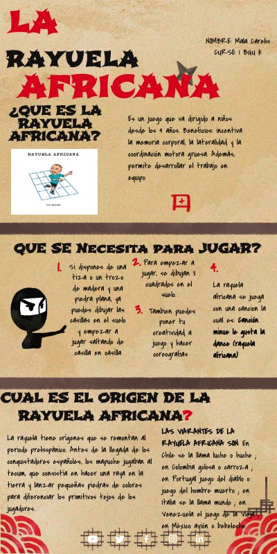 LAS VIARANTES DE LA RAYUELA AFRICANA SON: En Chile se la llama luche o huche ; en Colombia golosa o carroza ; en Portugal juego del diablo o juego del hombre muerto ; en Italia se la llama mundo ; en Venezuela el juego de la Vieja ; en México avión o bebeleche.